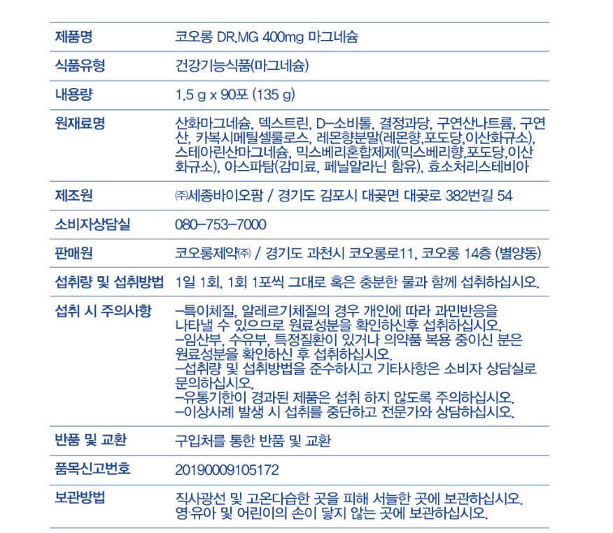 코오롱 DR.MG 400mg 마그네슘은 하루 섭취량을 충족합니다.